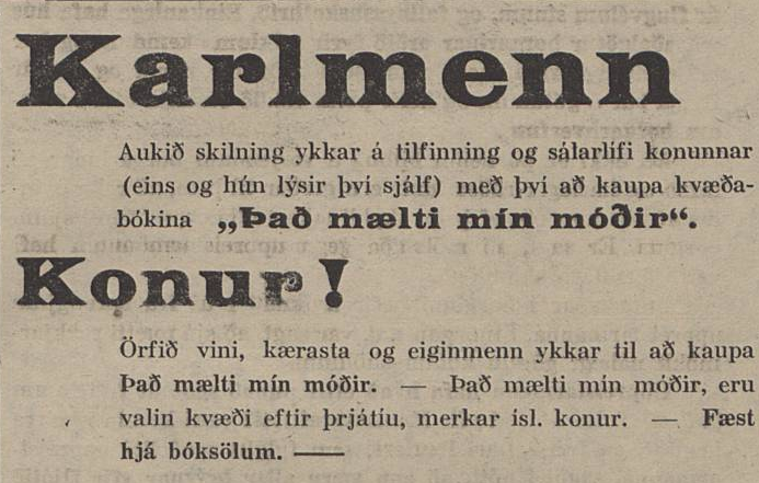 Hér vekur óneitanlega athygli að auglýsingin beinist einvörðungu að körlum. Jafnvel þar sem konur eru ávarpaðar sérstaklega er það til þess gert að biðja þær um að fá karla til að kaupa bókina. Hvergi eru konur hvattar til að ná sér í eintak. Ætli þær þyki ekki líklegar til að lesa ljóð, þó svo að þær dundi sér við að yrkja þau? Hvað sem því líður þá má vera ljóst að heimur skáldskapar er fyrst og fremst karlaheimur.